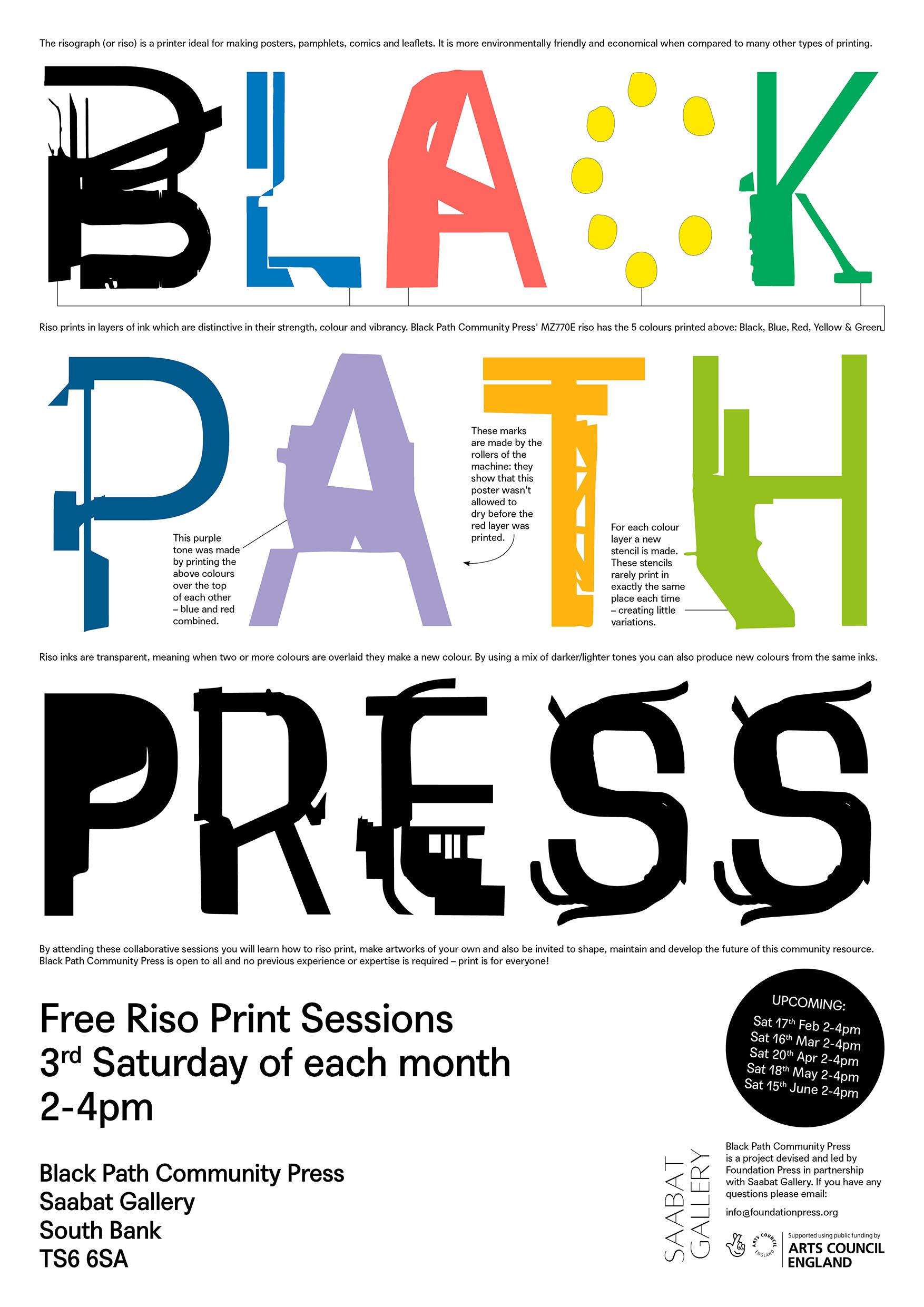 Black Path Press is a community printing press in South Bank, Middlesbrough – operating near the historic route known as the black path. The press is based around a MZ770E risograph printer which now lives at Saabat Gallery. Over the course of 2024 we provided free monthly workshops sharing knowledge of how to use the riso and inviting the public to feature in a group show held in November 2024.