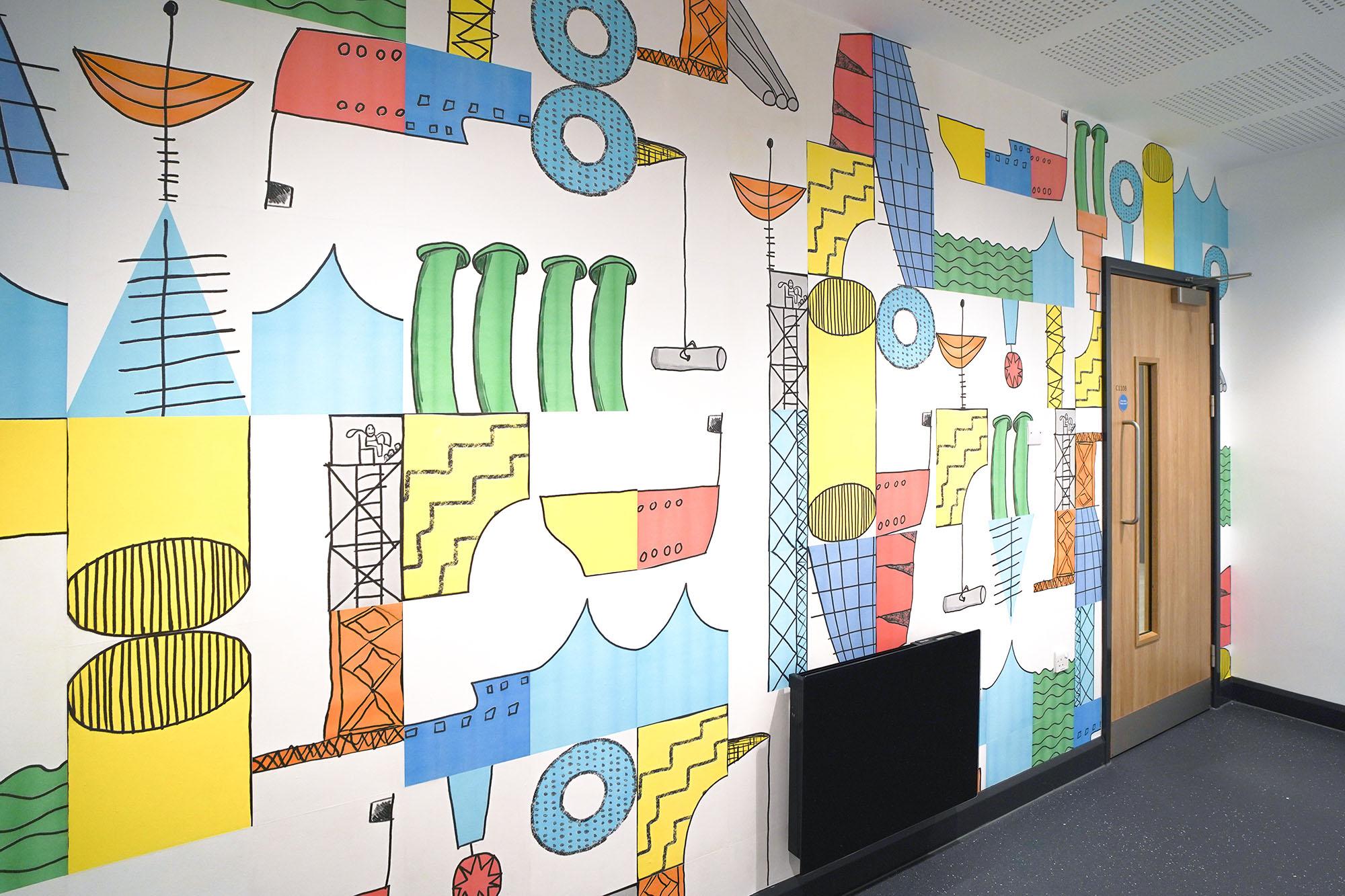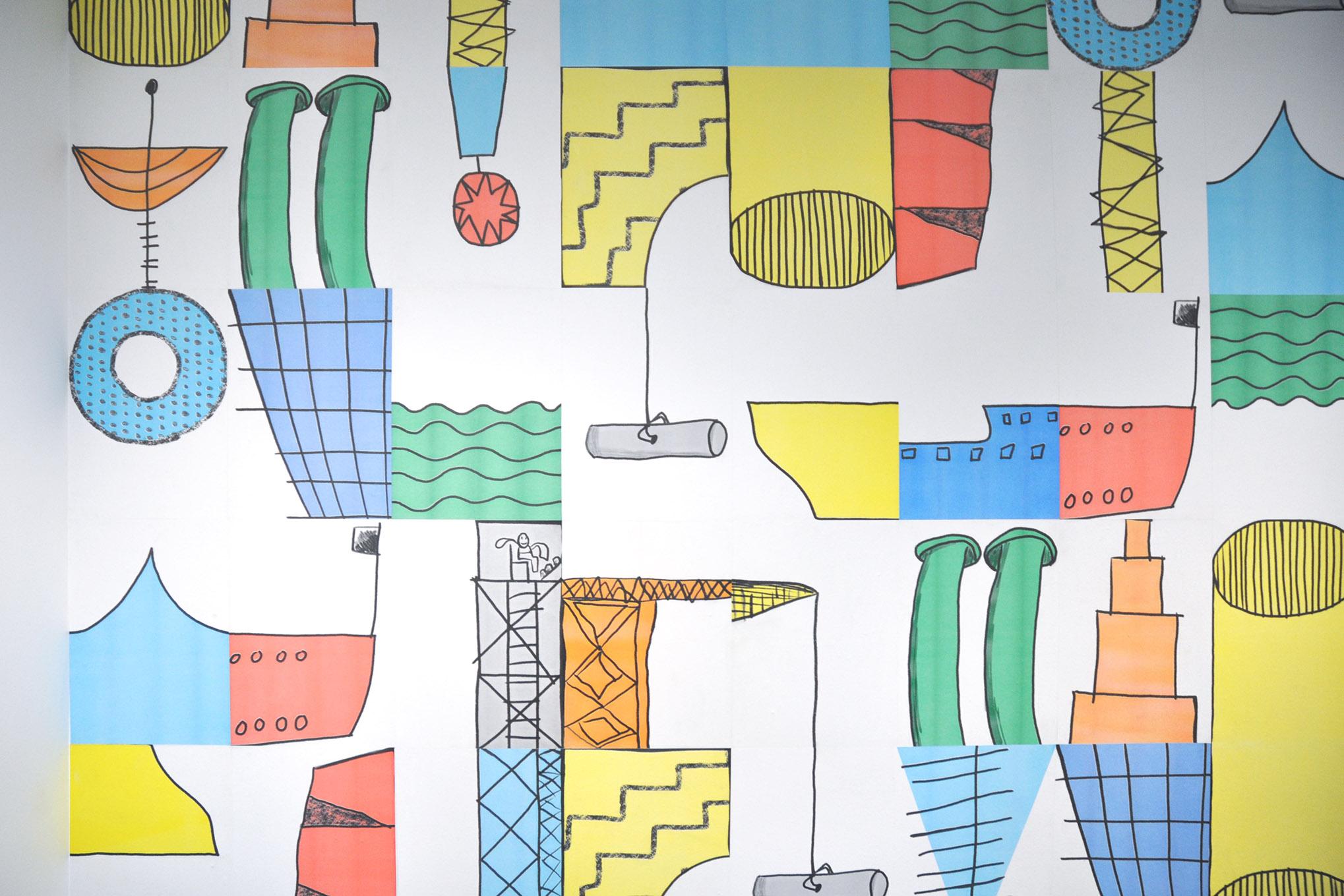This project worked with children from SS Peter & Paul RC Primary School in South Shields to develop 3 collaborative risograph-printed wallpaper designs for the headquarters of Doggerbank Wind Farm. Dogger Bank Wind Farm is an offshore wind farm located between 130km and 190km from the North East coast of England at their nearest points. Collectively they will become the world’s largest offshore wind farm with a headquarters in Port of Tyne. Through working with Year 3 and 4 children we explored the idea of wind power from different angles – combining imaginary and factual representations to different effect.