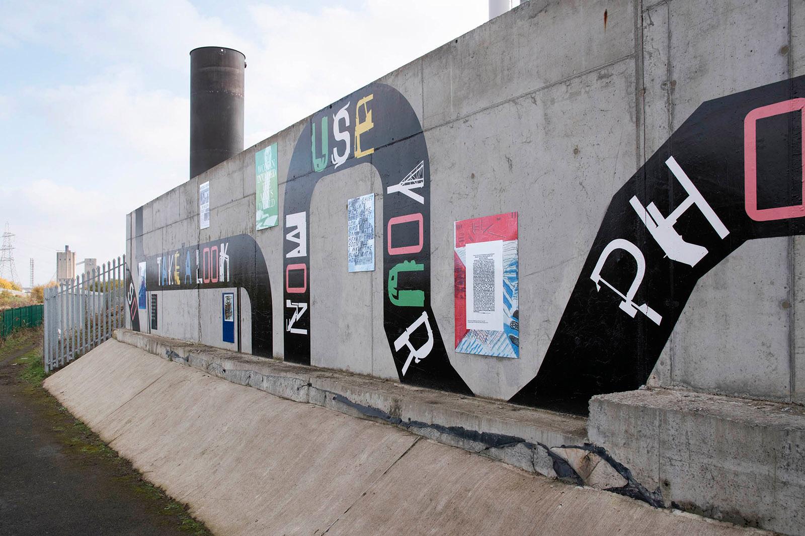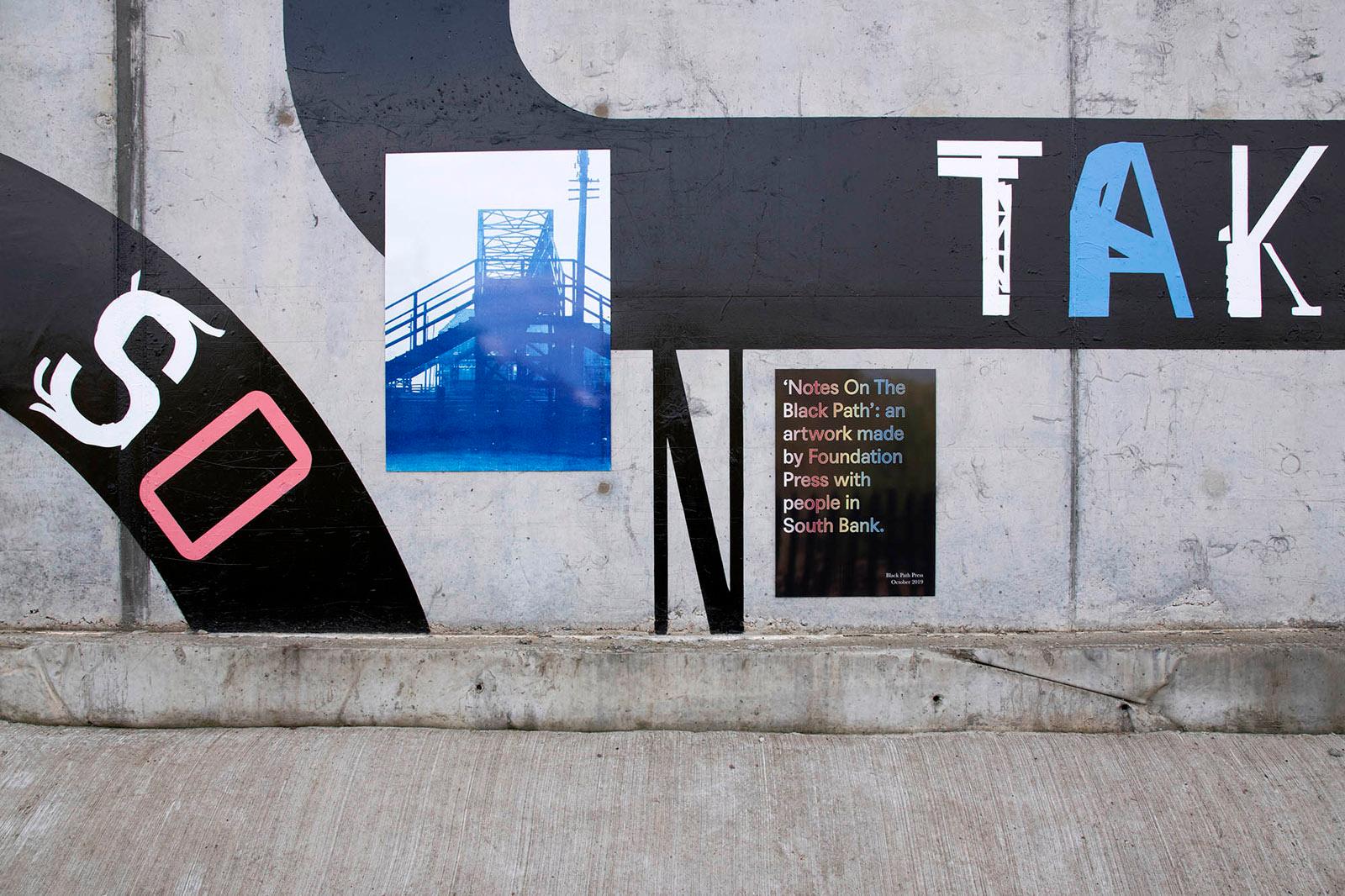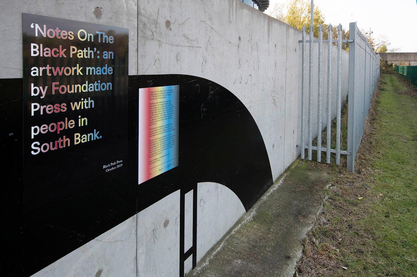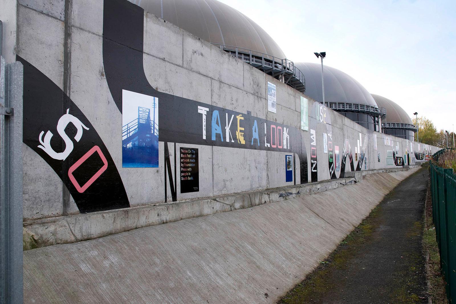 Notes On The Black Path is a public artwork made by Foundation Press with people in South Bank, Middlesbrough; an area surrounding the historical route known as the ‘Black Path’. The artwork features nearly 50 poster designs placed around a lyric by the South Bank-born songwriter Vin Garbutt. The lyric taken from the song 'Photographic Memory' reads: SO TAKE A LOOK NOW USE YOUR PHOTOGRAPHIC MEMORY TO HELP YOU TO DEVELOP YOUR TOMORROWS'. Content for the mural was collected via Black Path Press – a community press created especially for the project and based in Golden Boy Green Community Centre, South Bank.
