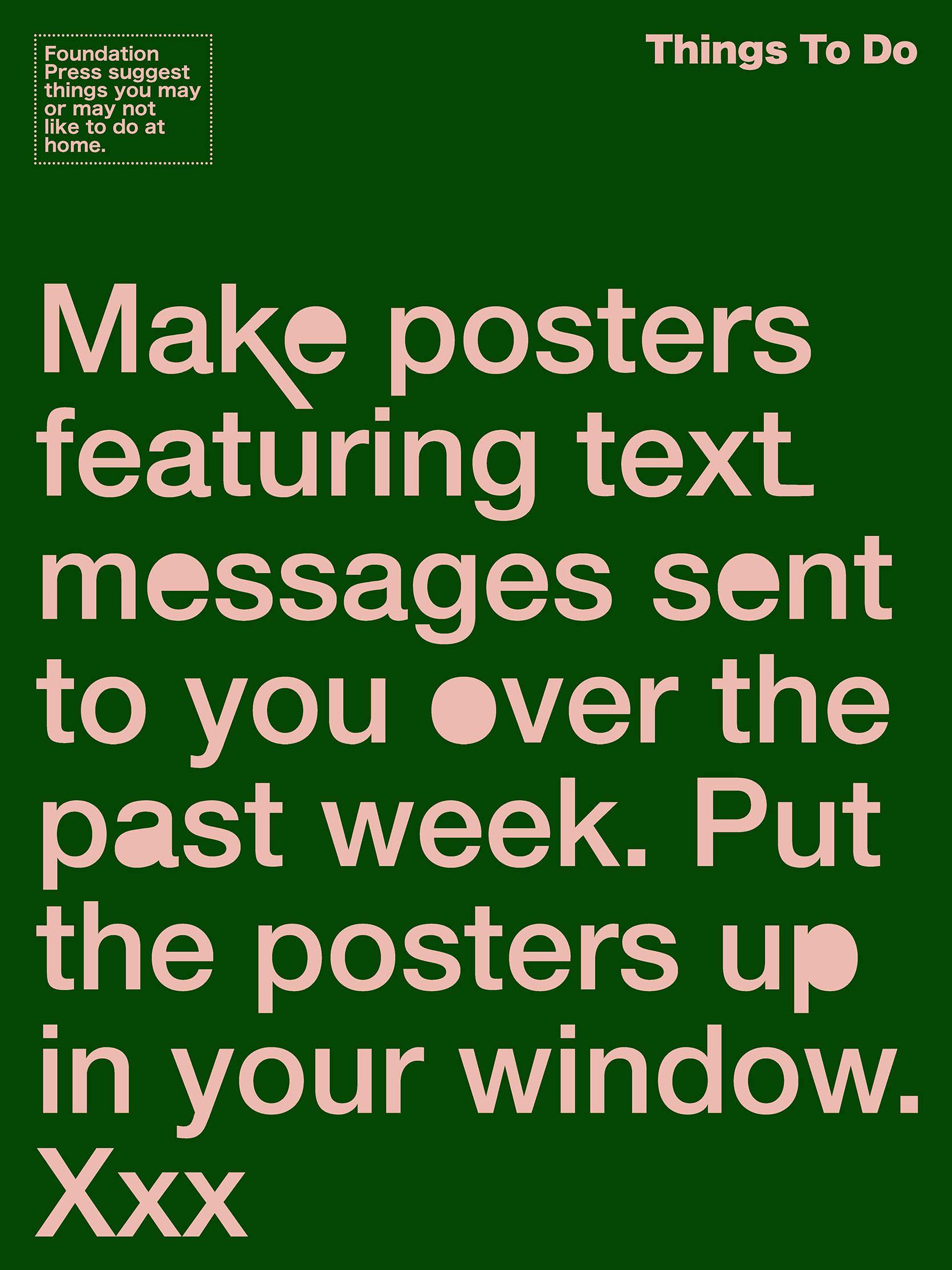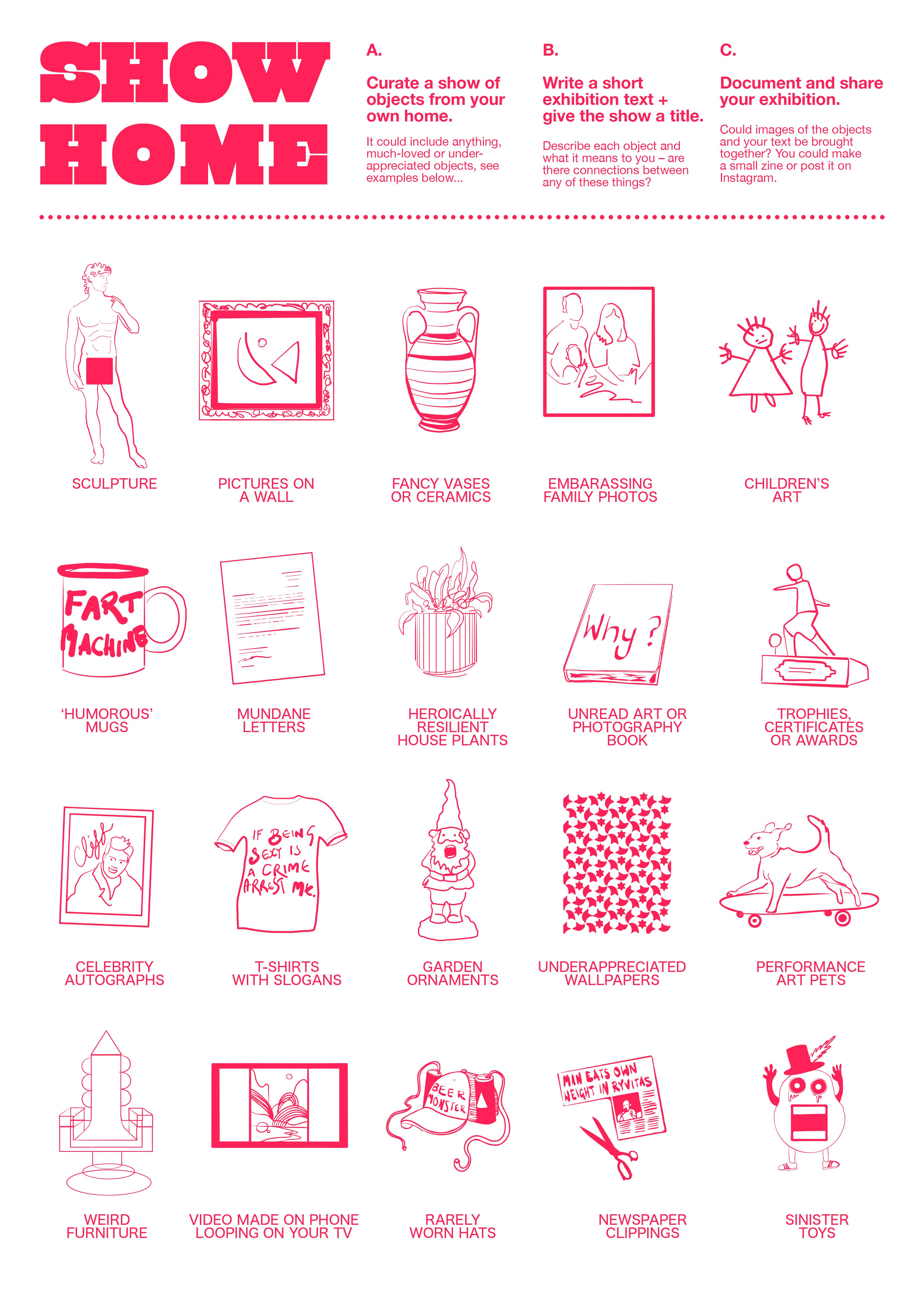Things To Do is an ongoing series of creative task sheets, started during lockdown in 2020. Click on an image below to see the full explanation and for examples of responses. In 2022 we commissioned a number of Things To Do activities designed by other artists including Chloe Briggs, Ciara Phillips, Paul Becker, Glasgow Open Dance School, Kate Owens, The Big Family Press, Katie Schwab, Nicola Singh and Temporary Services.